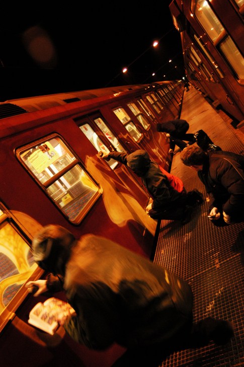We watch through the fence as cleaners move as quickly as they can through the trains. When they are done, once they have disappeared with their bin bags and the guards are tucked up in their cabin with warm coffee, we are on the move. In single file we emerge and run along the tracks to where three trains, all lit up and groaning, sit waiting. The crew wastes little time. Within seconds they are up on the metal walkway that runs between the trains, spread out with cans in their hands.